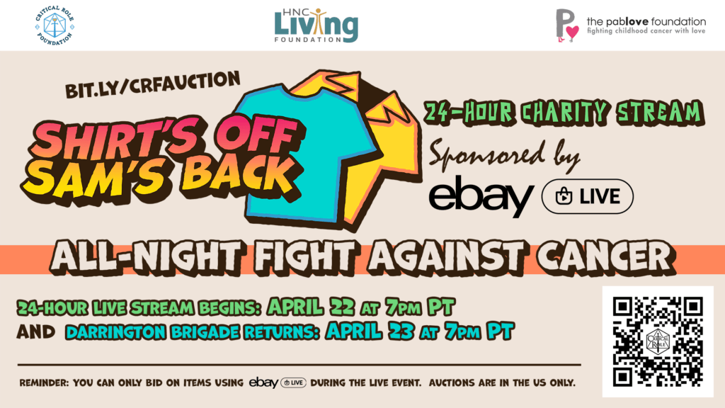 In less than one month, eBay live is partnering with the Critical Role Foundation for the “Shirts Off Sam’s Back Charity Stream: An All Night Fight Against Cancer”!